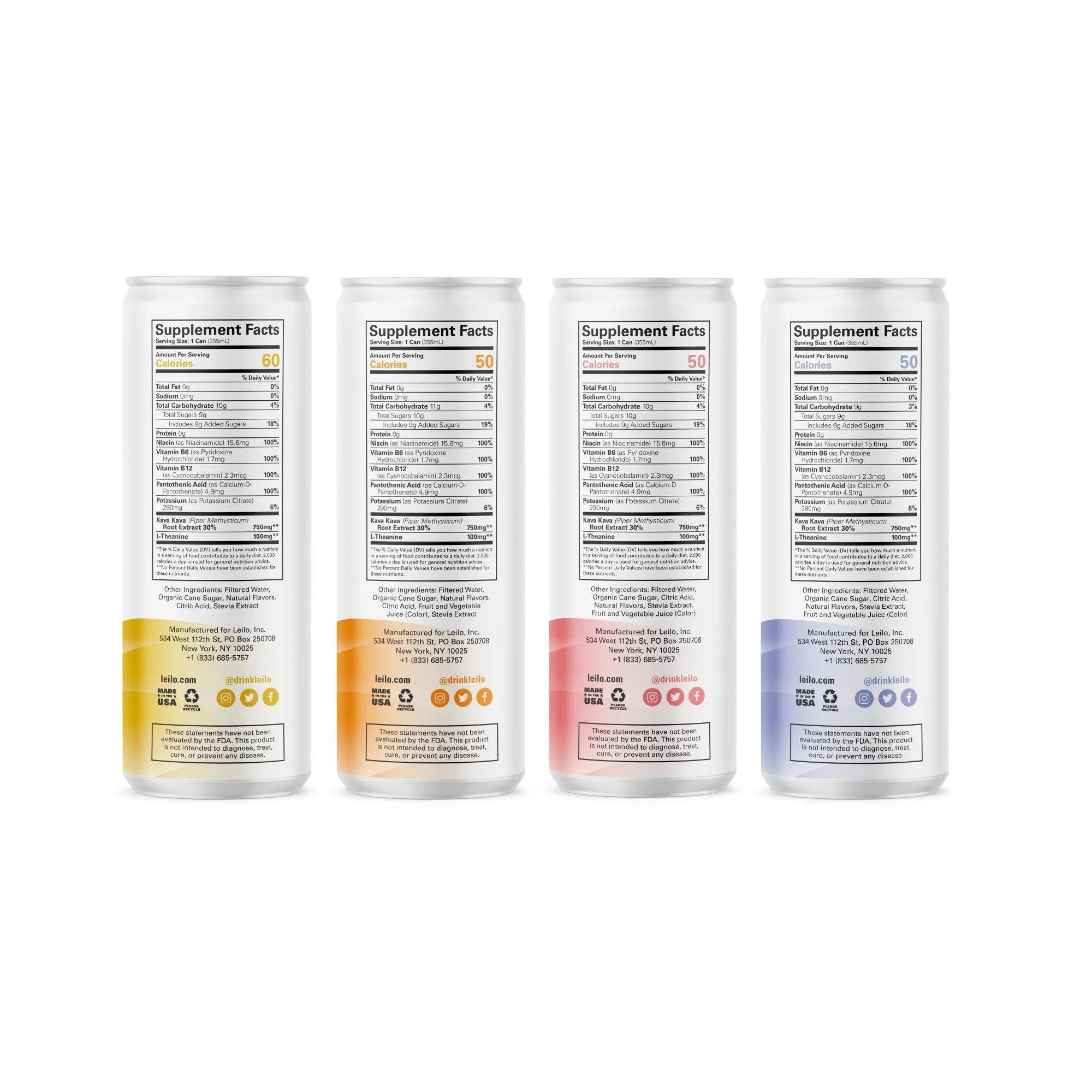 The variety pack includes 4 cans of pure Kava...1 can each in 4 tantalizing flavors: Lemon Ginger, Tango Berry, Raspberry Hibiscus, and Blackberry Orange. Made with only the finest ingredients, Leilo is the world's best-tasting kava. Our take on Kava is the perfect way to wind down after a long day.